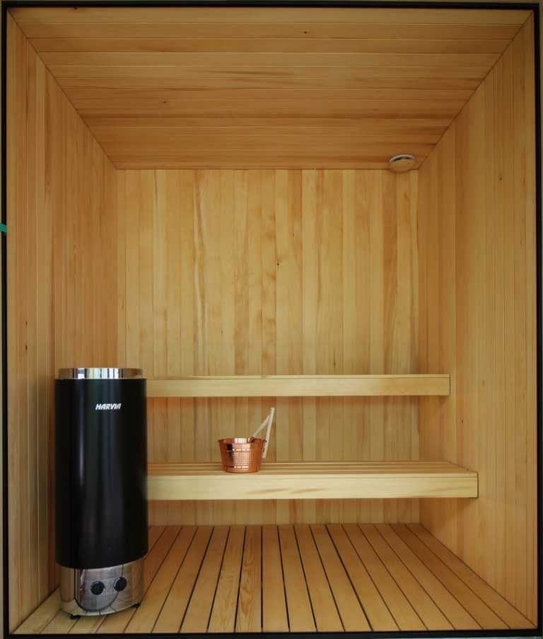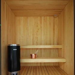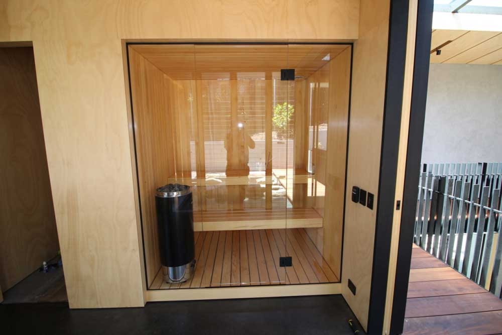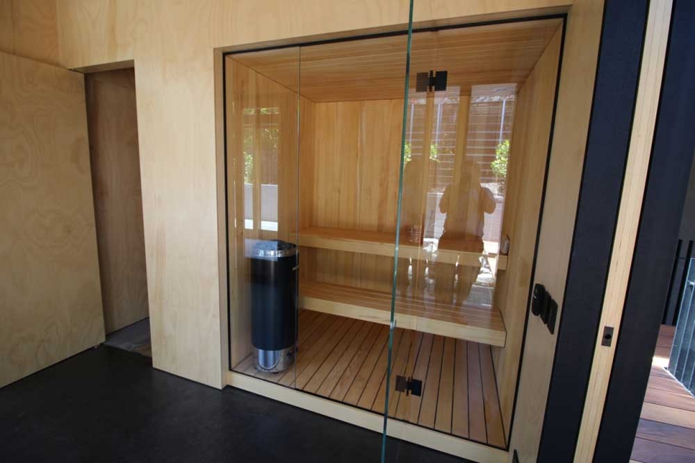 The sauna, with a ceiling height of 2.1 metres, has two tiers of benching: the lower bench 400mm deep and the upper bench, 600mm. The dressed Alaskan Yellow Cedar panelling and benching were custom milled specifically for this project. Alaskan Yellow Cedar is a prime choice for sauna construction since the wood thrives in wet environments. It is highly rot and insect resistant, very hard but light in weight, aromatic and rich in colour.
