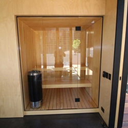 The discrete, floor standing black Harvia electric tower heater is tucked into a corner to maximise space. Integrated controls in the heater allow for convenient monitoring and adjustment of the heat and humidity in the sauna. A bespoke frameless glass front with a centralised glass door, opening outward, provides natural light and creates a sense of spaciousness and elegance. This feature is not common in residential settings.