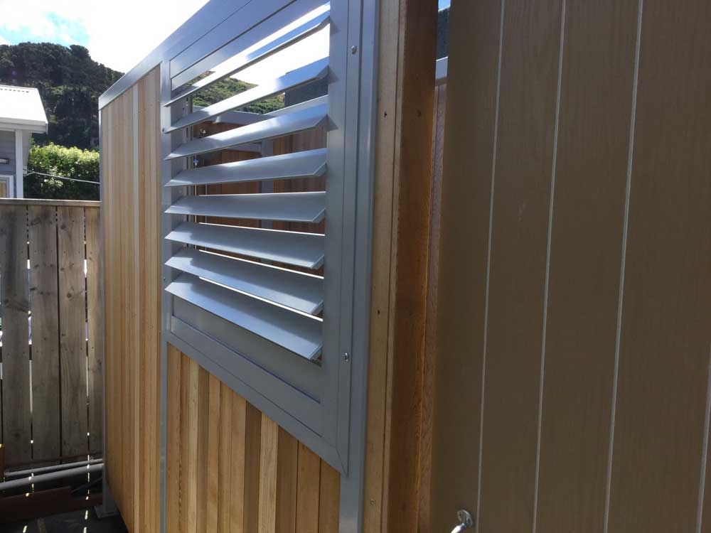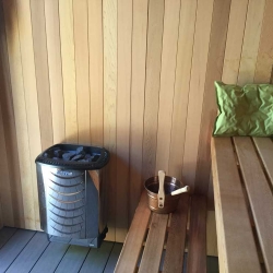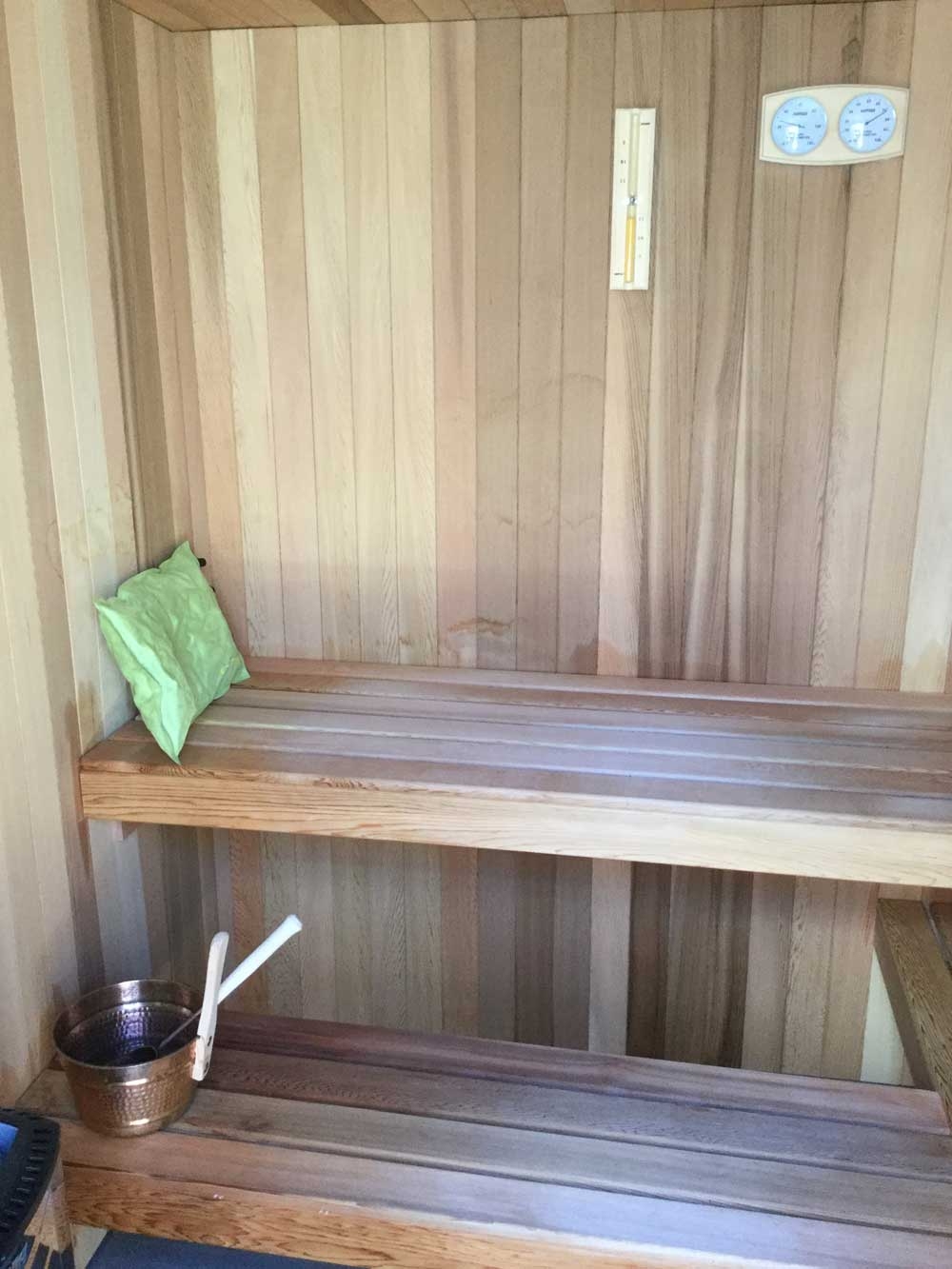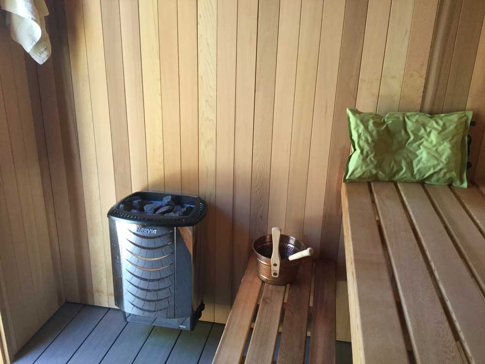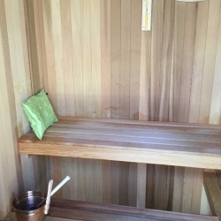 There is a glass window in the door as a safety feature and to provide natural light. A compact, wall mounted Harvia 8kW electric heater with integrated controls was installed, along with a bulkhead light under the top bench, and an outside power switch. The sauna has natural draught-fed ventilation which relies on thermal energy from rising heat to vent the sauna room properly.