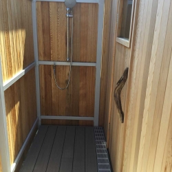 The outdoor sauna has a Western Red Cedar interior, with two tiers of L-shaped benching to accommodate up to four bathers. The choice of wood is perfect for the sauna’s interior because of its ability to resist decay, moisture and wear, as well as for its rich colour and pleasant scent.