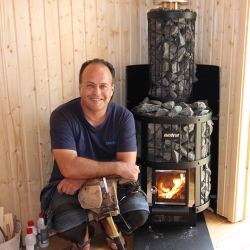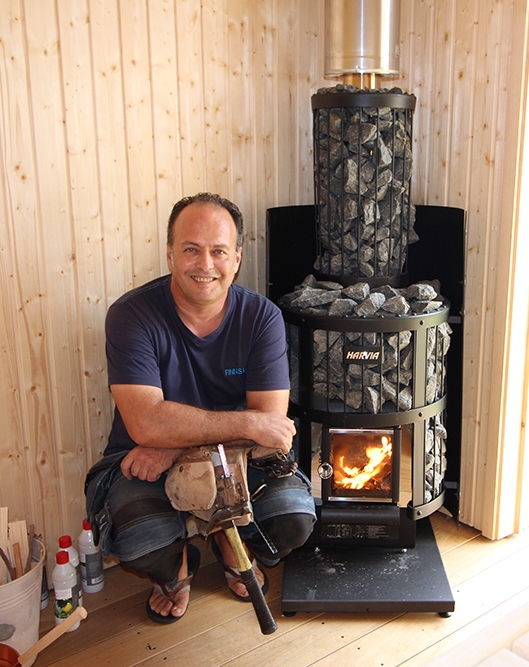 The wood-burning Harvia Legend sauna heater, with high stone volume capacity, was installed very much as one would a fireplace or wood stove ‒ and it looks as attractive and inviting. The heater is placed in the corner near the door to maximise the space available for benching.