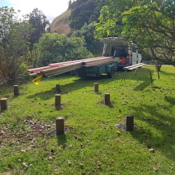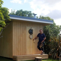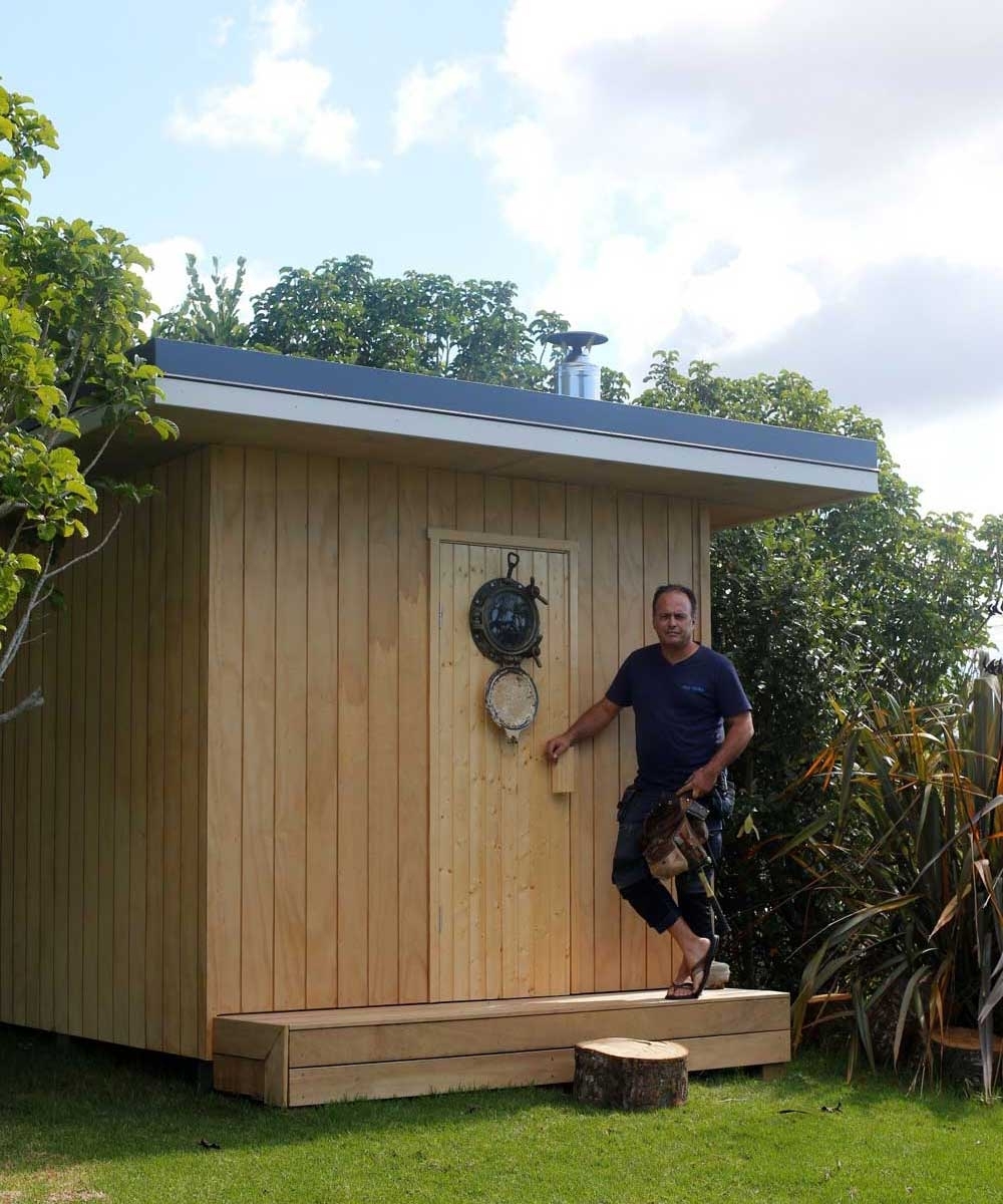 Our residential client located in Matakana, just North of Auckland, required a very traditional, free-standing outdoor sauna large enough to comfortably accommodate four bathers. The site selected for the structure is ideal: on top of a hill with stunning views and absolute privacy, tucked away in the garden but near enough to the house for convenient use, especially in cold, wet weather.